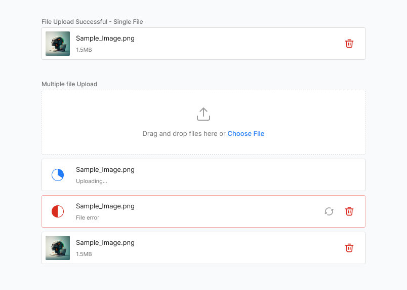 File Upload inherits the status properties of Input — none, success, warning, error, loading.
